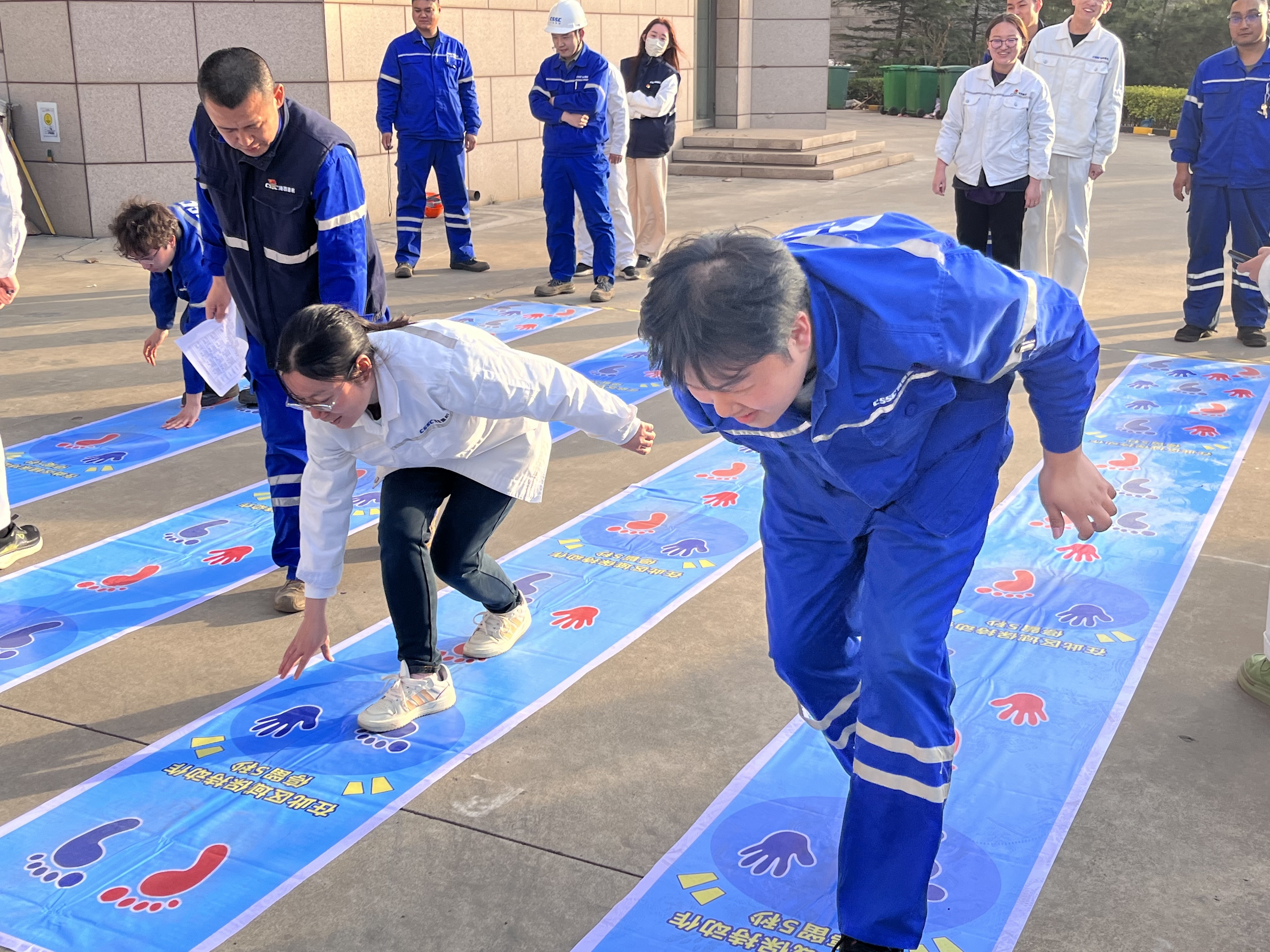 備受矚目的“巨人腳步”項目中,港口機械工程所的隊伍以口號統一步伐,如“鋼鐵巨人”般穩步沖向終點,展現了驚人的默契。“集體跳長繩”更是高潮迭起,跳繩隊員的靈活身姿與搖繩者的精準節奏相得益彰,最后品質管理部以3分鐘完成102次的佳績摘得單項冠軍。技術中心分會的謝士嬌在“摸石過河”中表現搶眼,她巧妙鋪磚、輕盈跨步,為團隊節省關鍵時間。“我們女同事可是‘戰術擔當’!”她賽后笑稱。
