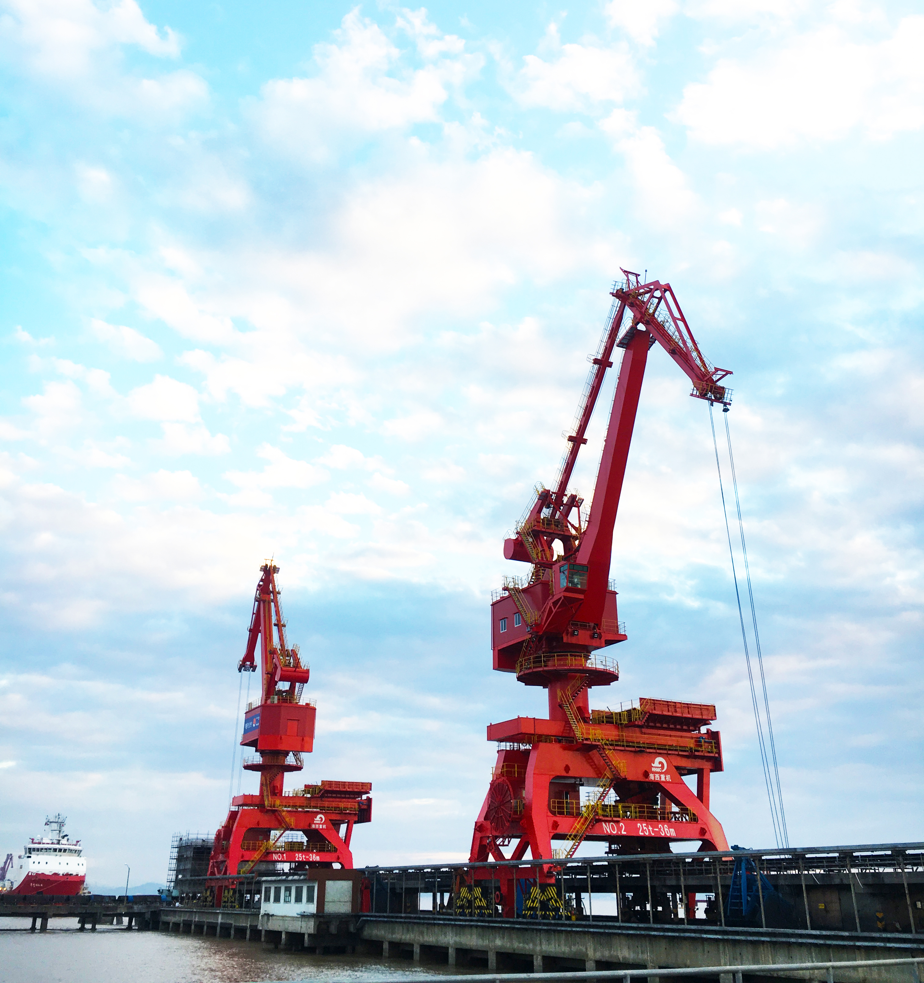 這2臺(tái)門機(jī)為25T-36M四連桿帶斗門座式起重機(jī),額定起重量可達(dá)25噸,工作幅度36米,額定工作效率800噸/時(shí),是海西重機(jī)成熟的門機(jī)產(chǎn)品,也是目前各大港口廣泛使用的典型門機(jī)之一,設(shè)備主要用于煤炭和海沙的卸船。