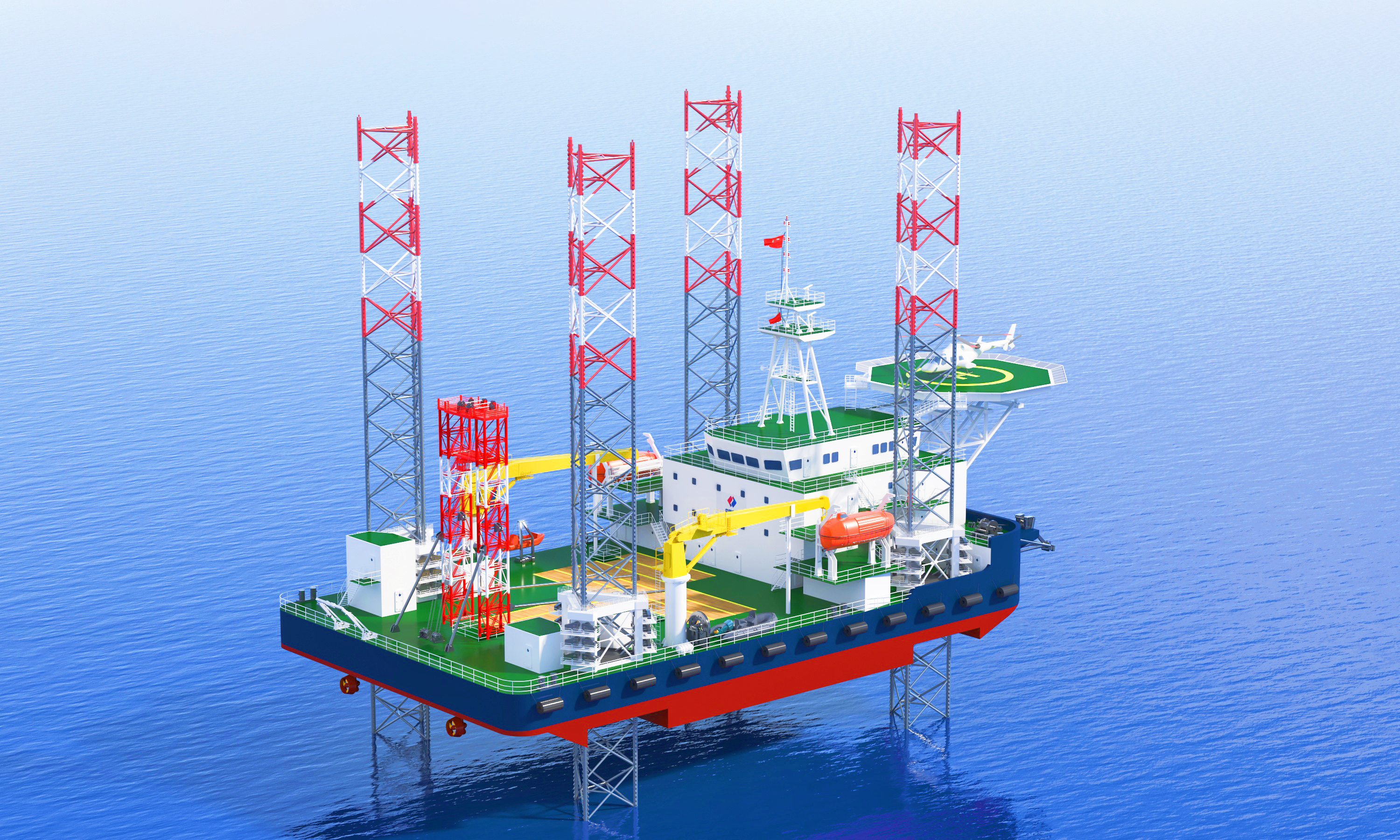 該平臺入級CCS,為鋼質(zhì)四樁腿自升式,采用電動齒輪齒條升降系統(tǒng),由平臺主體、樁腿(帶樁靴)、升降系統(tǒng)、推進(jìn)系統(tǒng)、DP-1 動力定位系統(tǒng)、太陽能光伏、勘測試驗(yàn)設(shè)備設(shè)施等部分組成。平臺樁腿全長約100米,最大作業(yè)水深75米,是國內(nèi)作業(yè)水深最深的勘測試驗(yàn)平臺,主要用于海上工程勘測一體化作業(yè)及科研,包括鉆探、原位測試、物探、土工試驗(yàn)等全作業(yè)流程。