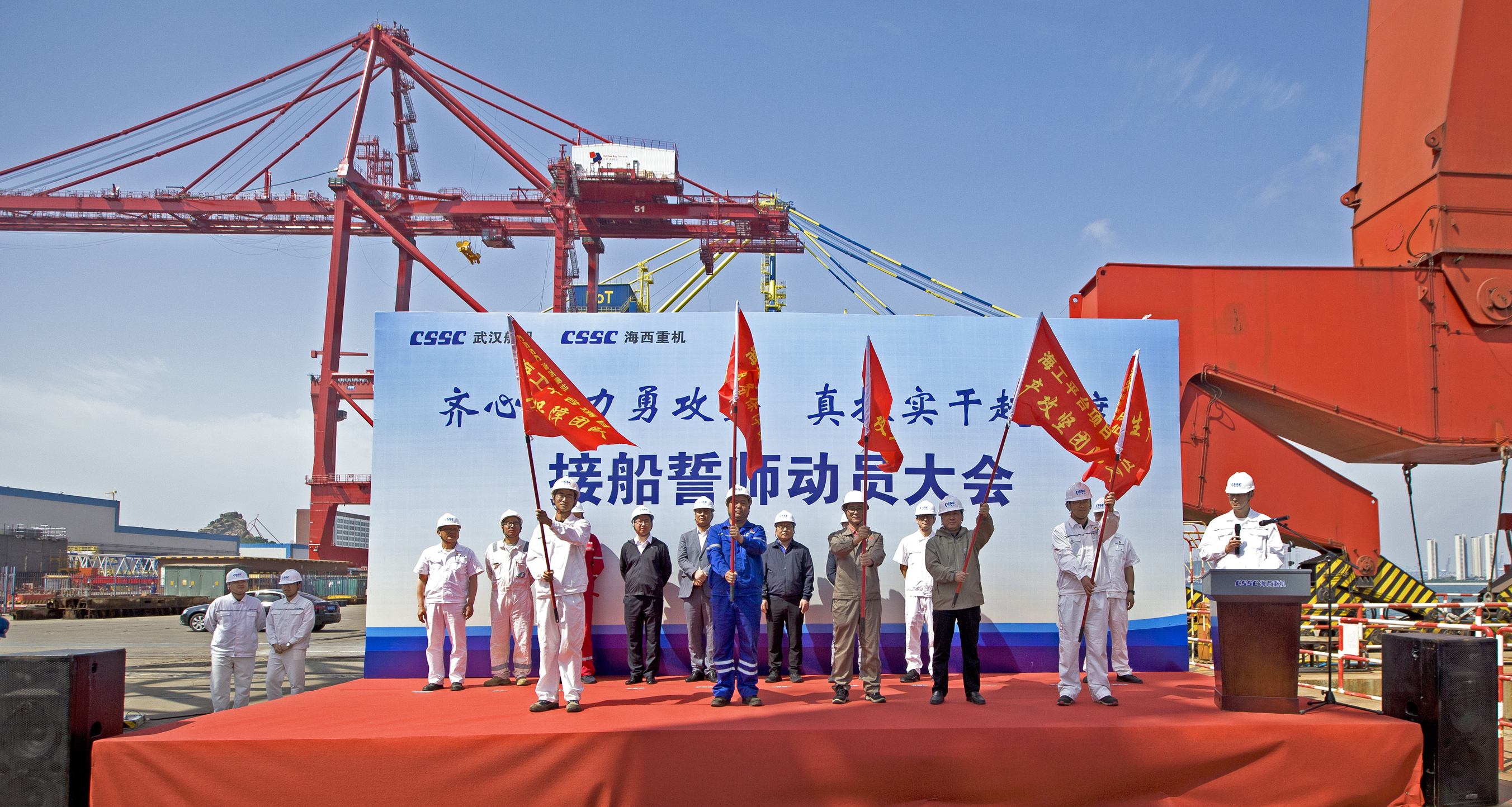 海西重機總經理蔣新標作動員講話,海西重機副總經理代振華、大津重工泰州分公司總經理杭友斌、江陰雙馬重工裝備有限公司副總經理徐惠國等3位同志代表施工方做了表態發言,并現場簽訂安全、質量、進度承諾書。同時對生產攻堅團隊、綜合服務保障團隊、安全保障團隊等5支團隊進行授旗,將動員大會推上高潮。