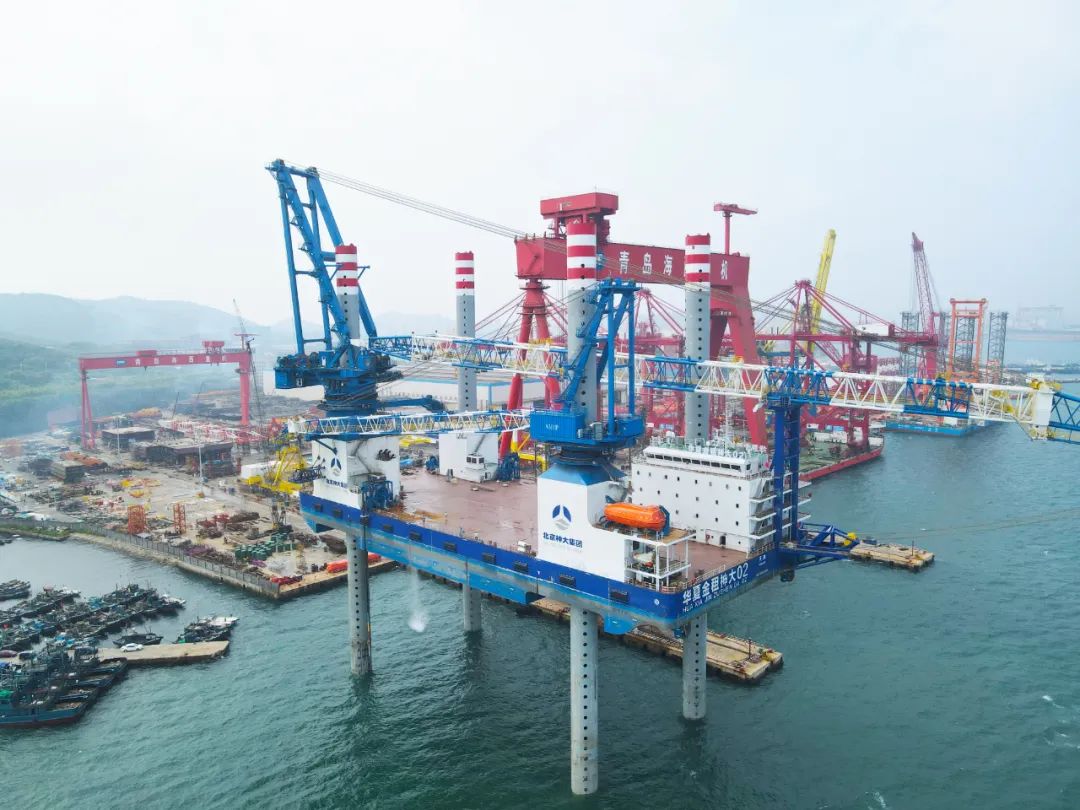 華夏金租神大02號1200噸風電安裝平臺于2022年8月21日開工建造,2023年6月30日到達青島,2023年8月21日完成試航。到達青島海西后,項目組成員在01號平臺成功交付的基礎上,采取扎實有效的措施,狠抓生產組織與過程控制,僅用了不到3個月的時間就完成主輔吊機安裝、樁腿接樁、系泊試驗、試航等主要工作,提前合同交貨期交船,向用戶交上了一份滿意的答卷。