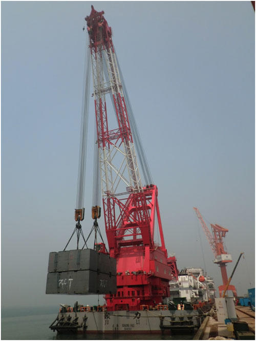 700T浮吊是我司為上海打撈局制作的全回轉浮式起重機。該機總重約2600噸,由轉盤總成、機房總成、回轉支撐及圓筒總成、人字架總成、臂架總成等結構構成。其額定起吊重量為700T,最大變幅幅度為68M,主要用于超重大件的吊裝作業,設備安裝作業及水上施工、打撈和救援作業。