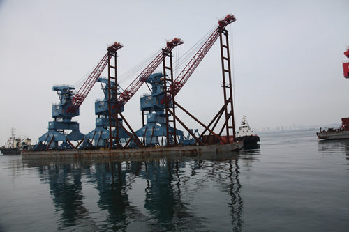 2012年8月17日,3臺(tái)單臂架門(mén)座式起重機(jī)(型號(hào):MQ25t-35m)離開(kāi)我司碼頭,駛向印尼第二港務(wù)集團(tuán)公司。
