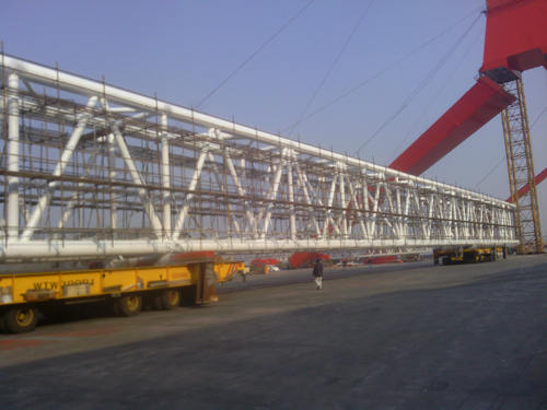 F1是我公司承造的3600T雙臂架變幅浮式起重機項目。臂架中段單片長113米,寬4.5米,高7米。鑒于該構件超長超重,我們采用兩臺平板車協同作業的方案。